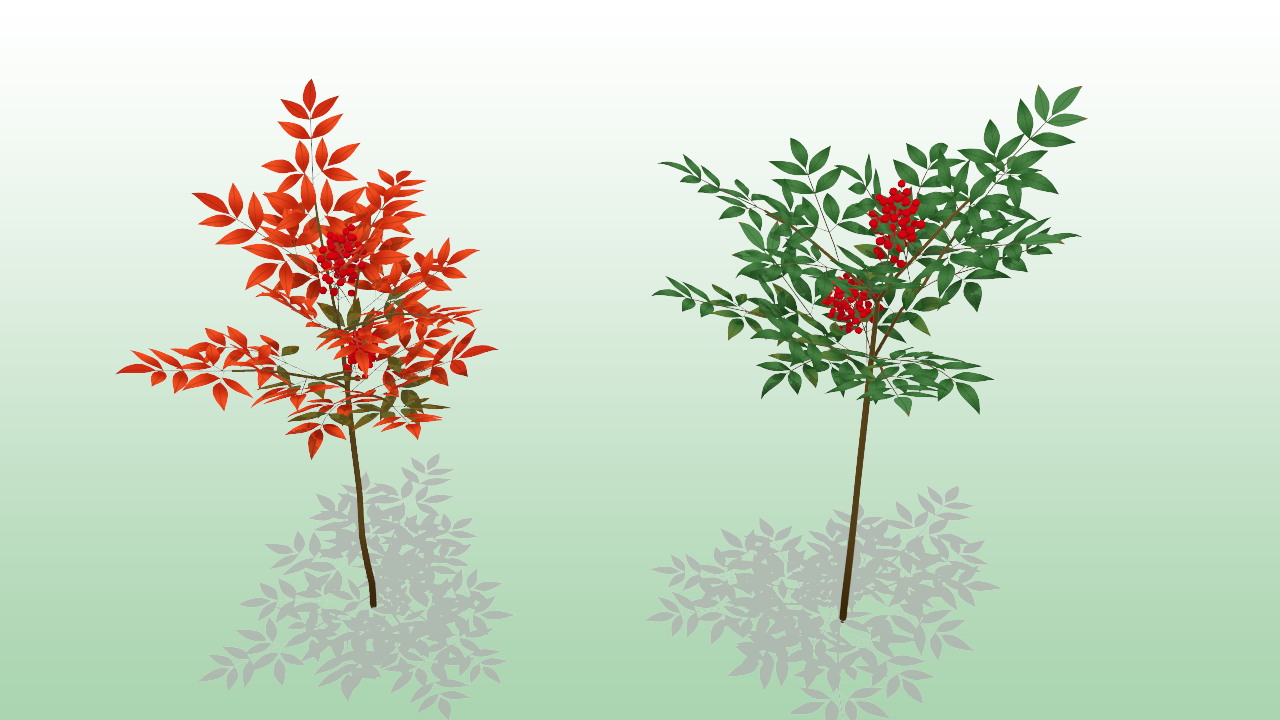 南天配布 難を転じて福と為す新しい年になりました。今年も健康で、好きなことが思いっきりできたらいいなと思っています。途中で放置しているものも多いので、今年の目標は「あきらめず、やり続ける」というところでしょうか。季節の植物として、南天モデルを作りました。冬枯れの景色の中でも、雪の中でも、この赤い実は鮮やかで、いかにも縁起の良い風情があります。赤く紅葉した南天の葉も美しいものです。緑の葉と赤い葉の二種類あり、モーフでサイズを小さくできます。このモデルは http://com.nicovideo.jp/community/co2136800 にて配布しています。 スカイドーム:azyazya様 MME:ドゥドゥ様 PR
